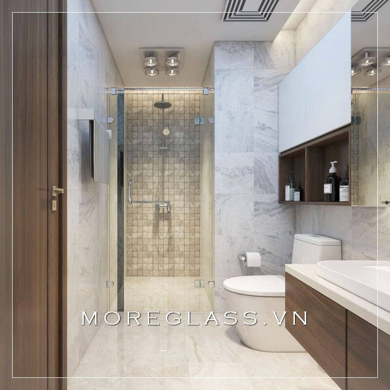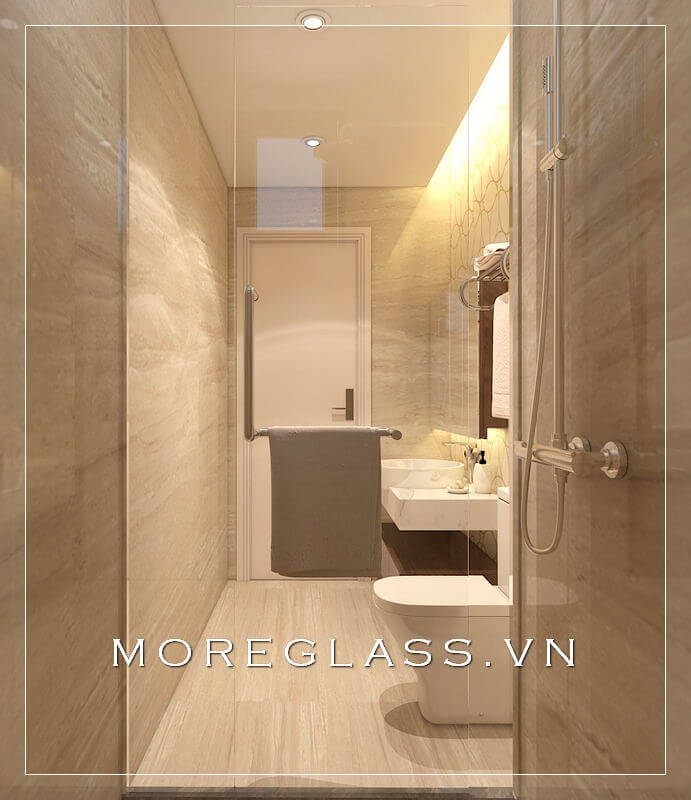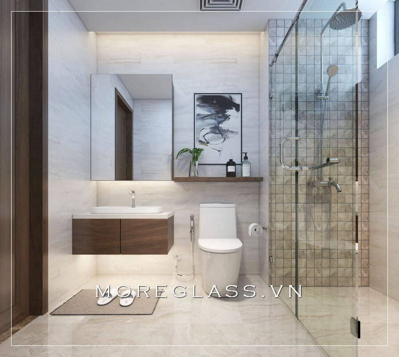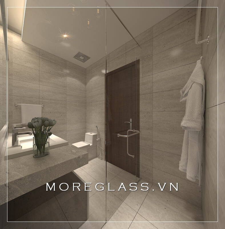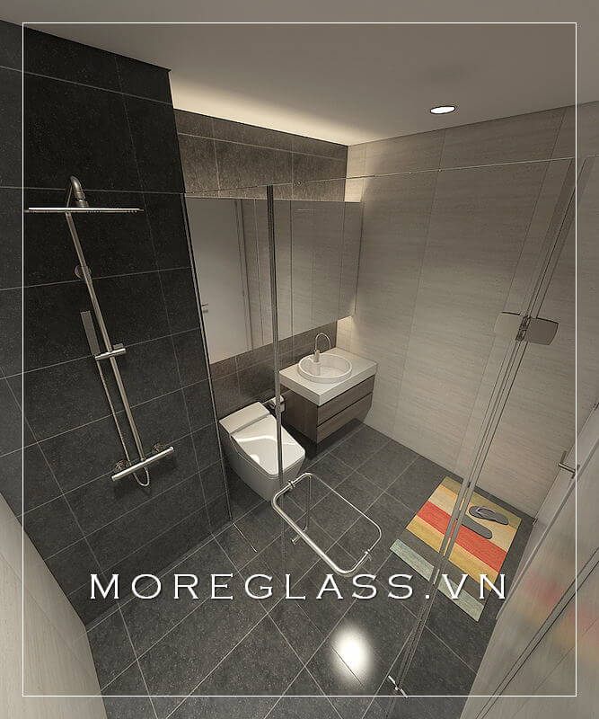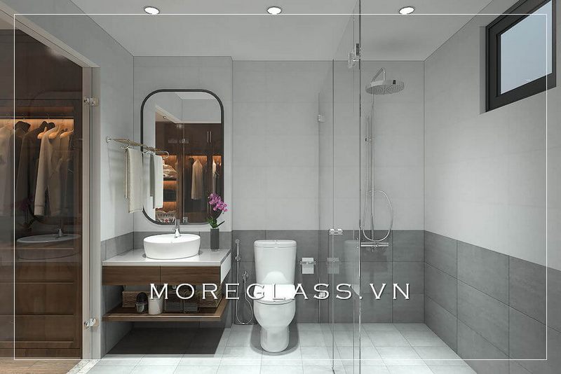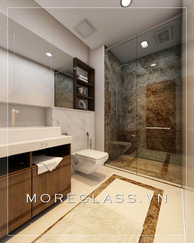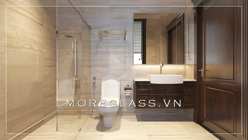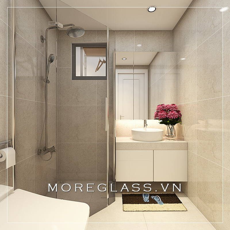 Cuốn hút với mẫu thiết kế phòng tắm chung cư hiện đại với phòng tắm kính đẹp, nhỏ nhắn sử dụng kính cường lực cao cấp giúp nước không bị bắn ra ngoài.