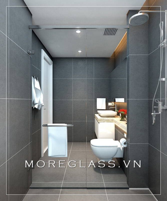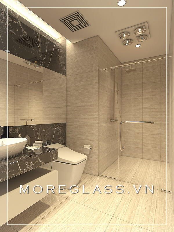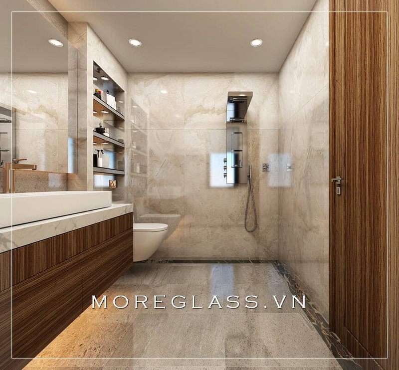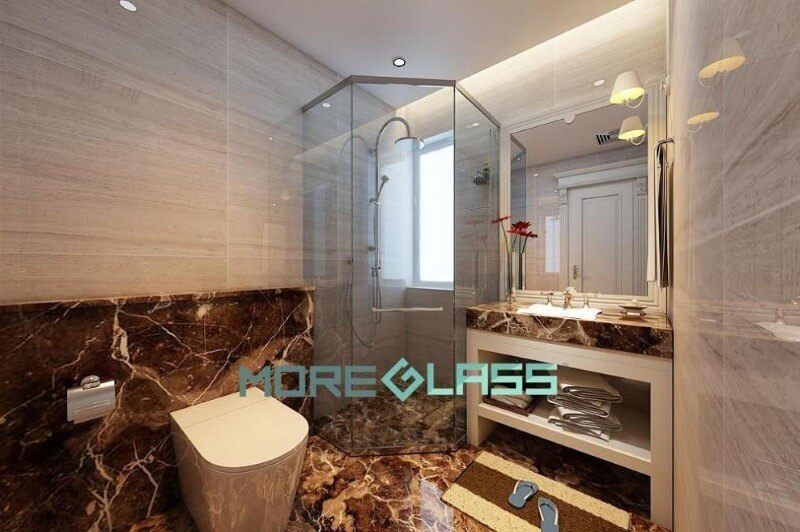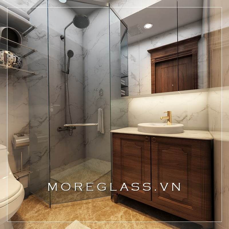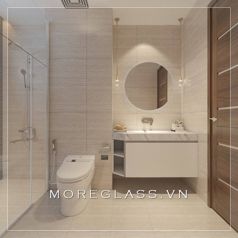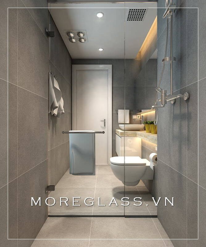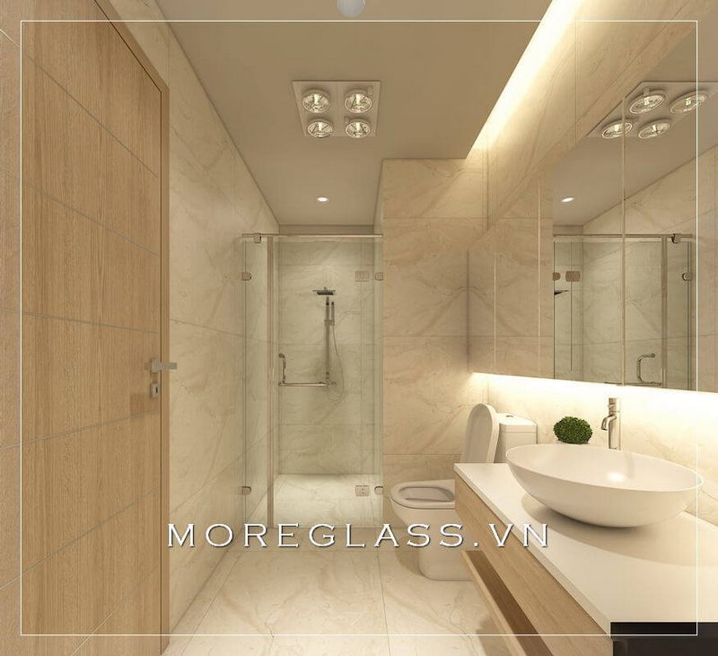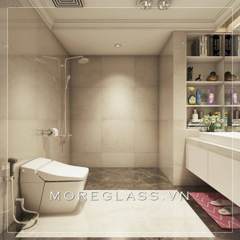 Cuốn hút với mẫu thiết kế phòng tắm chung cư hiện đại với phòng tắm kính đẹp, nhỏ nhắn sử dụng kính cường lực cao cấp giúp nước không bị bắn ra ngoài.