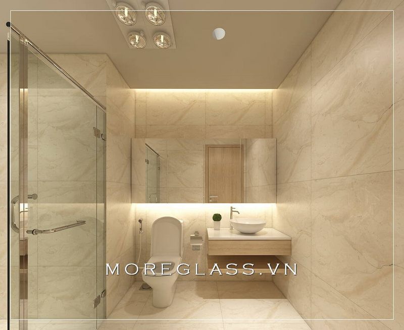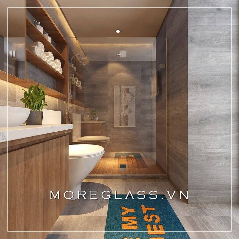 Mẫu thiết kế phòng tắm nhỏ sử dụng vách tắm cường lực để phân tách hai không gian phòng tắm và khu vệ sinh, nội thất tránh nước hắt ra ngoài.
