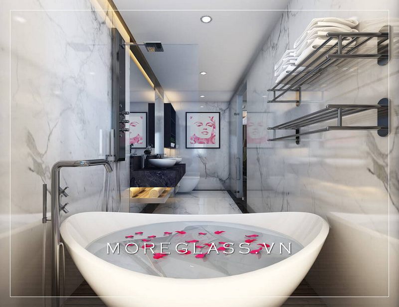 Đứng từ góc độ phòng tắm kính nhìn ra bạn có thể thấy đây là không gian phòng tắm hiên đại, tối giản về nội thất đem đến sự thông thoáng, cuốn hút