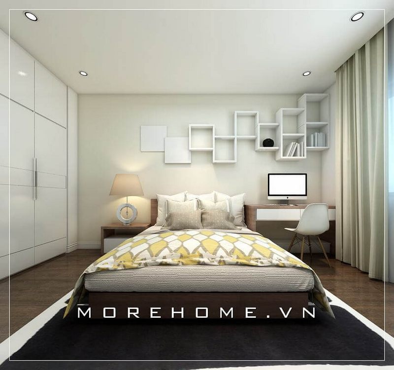 Mẫu giường ngủ thông minh có ngăn kéo phía dưới được sơn trắng phối với màu nâu của sàn gỗ và các nội thất khác mang đến không gian ấm áp, lãng mạn cho phòng ngủ