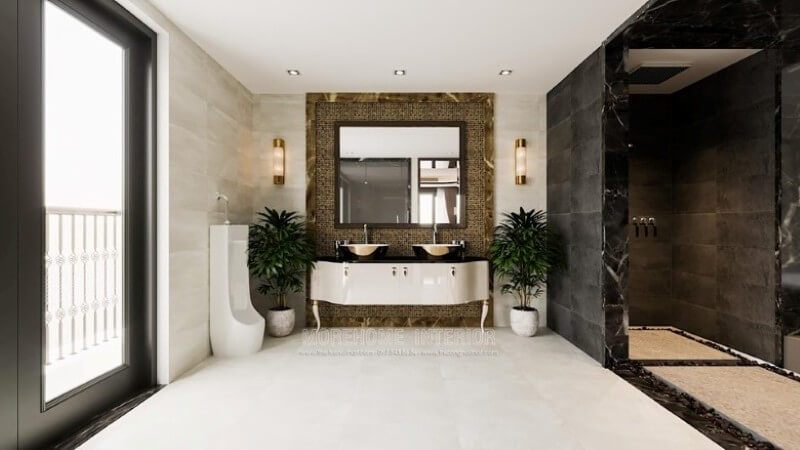 KTS đã khéo léo lựa chọn gương phòng tắm hình chữ nhật lớn, tạo cảm giác không gian phòng tắm rộng rãi hơn