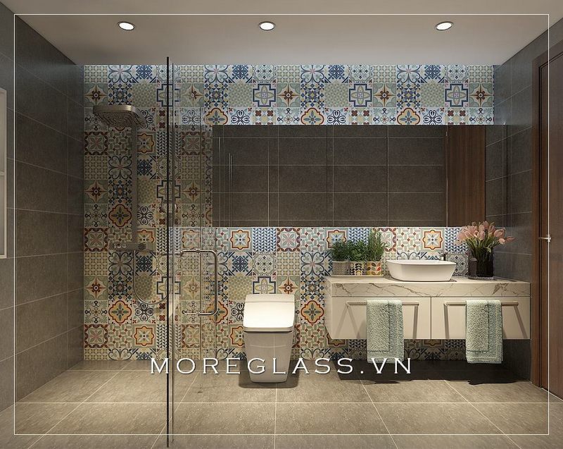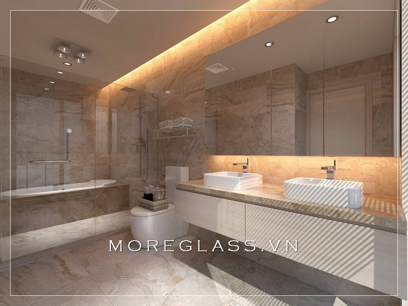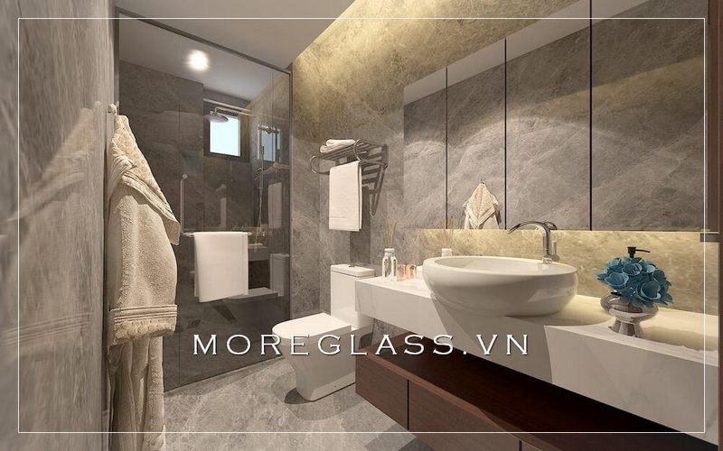Gương phòng tắm lớn kết hợp vách ngắn kính cường lực cao cấp giúp không gian căn phòng rộng rãi, thông thoáng