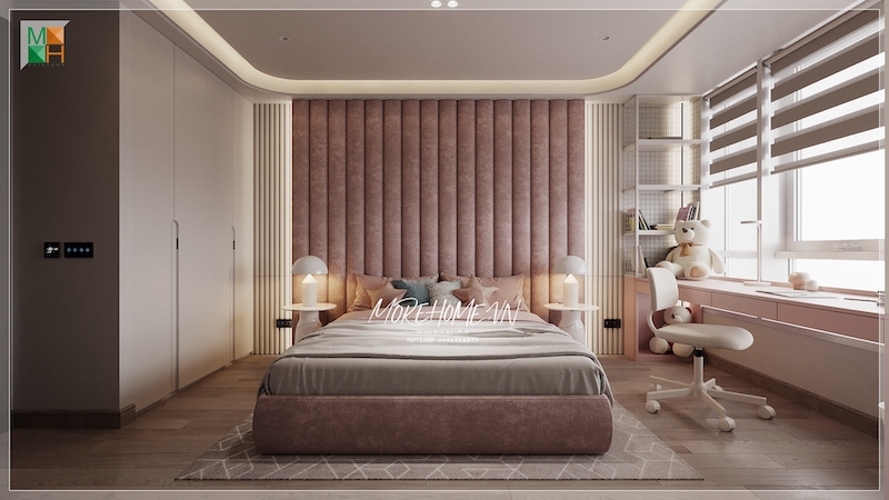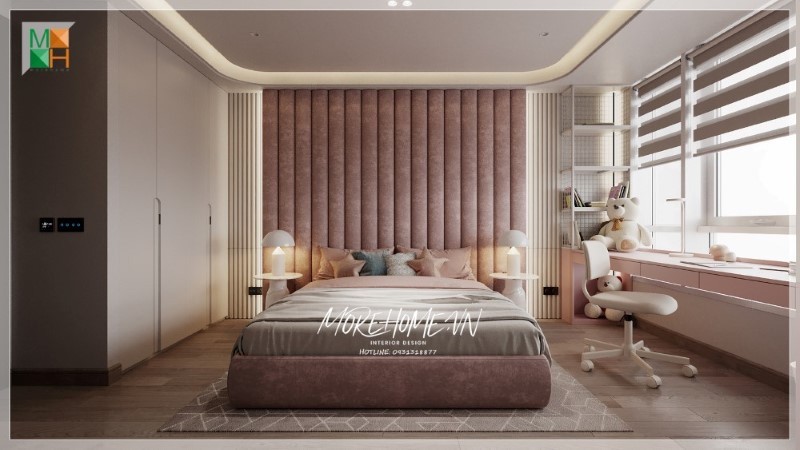 Phòng ngủ màu hồng phấn: Sử dụng màu hồng phấn làm màu chủ đạo, kết hợp với trắng hoặc xám nhạt để tạo nên không gian ấm áp, dễ thương nhưng không kém phần sang trọng.