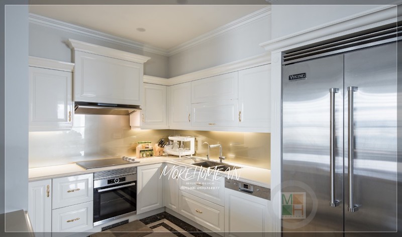 Tủ bếp màu trắng được thiết kế mang phong cách tân cổ điển sang trọng