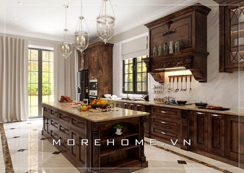 Mẫu bàn đảo bếp tự nhiên gỗ tân cổ điển, sang trọng và đẹp mắt, cùng với mặt bàn ốp đá màu vàng cao cấp sẽ làm cho không gian phòng bếp biệt thự trở nên tiện nghi hơn.