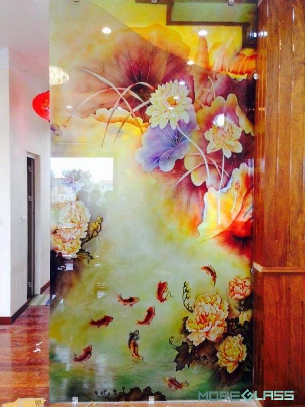Mẫu vách kính khắc 3D có những hình tranh cá chép, hoa sen và mẫu đơn, mang lại ý nghĩa phong thủy giúp cho gia chủ có những điều may mắn, tốt lành và bình an.