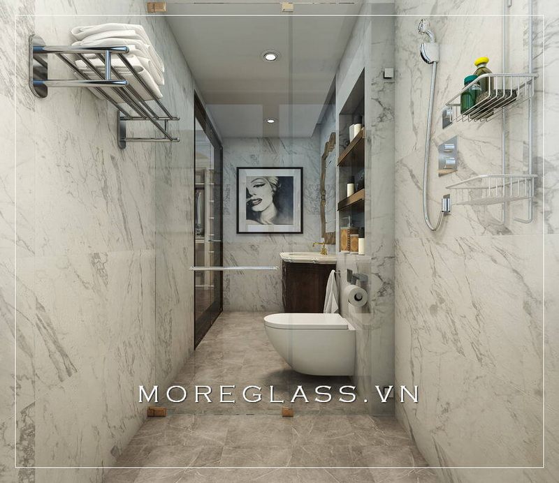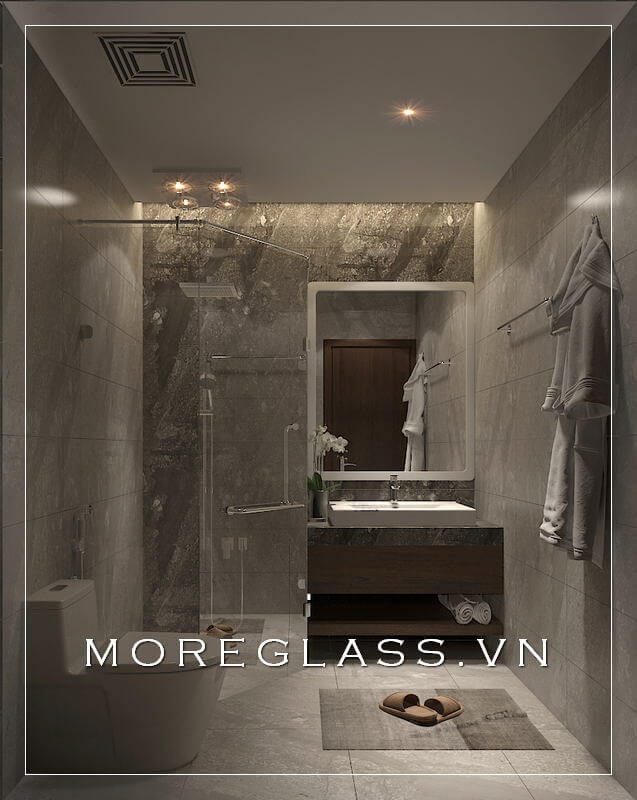 Sử dụng đá tự nhiên cao cấp, ốp nền và tường kết hợp với vách kính tắm cường lực, chúng tôi sẽ tạo ra một không gian hoàn hảo trong từng chi tiết cho mẫu thiết kế phòng tắm đẹp của bạn và phân cách hai không gian nhà vệ sinh và phòng tắm.