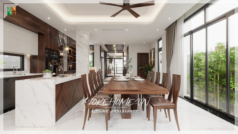 Thiết kế phòng bếp - ăn tràn đầy ánh sáng khi được ngăn cách với bên ngoài bởi một lớp kính trong suốt, trong đó là nội thất hiện đại từ gỗ óc chó và đá sang trọng.