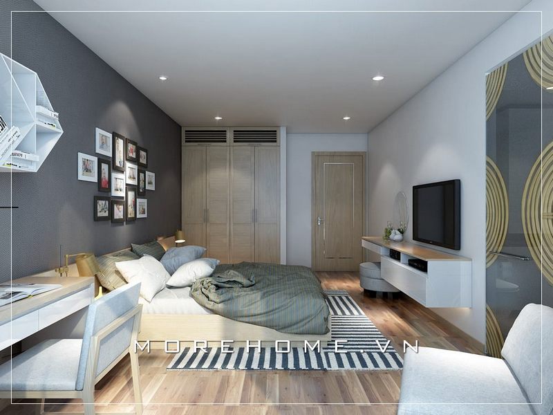 Phòng ngủ chung cư hiện đại được bố trí với phần kệ tủ treo tường và bàn làm việc tiết kiệm không gian