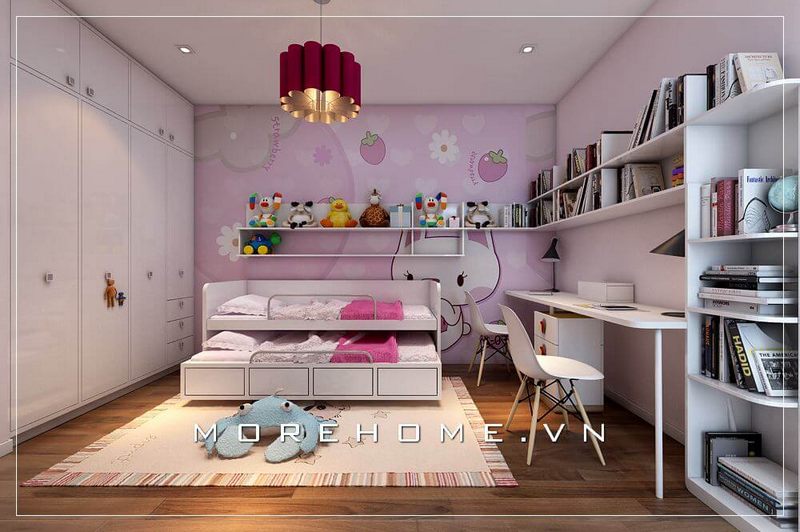 Thiết kế phòng ngủ con gái đầy ấn tượng, nội thất được bố trí khoa học, hợp lí giúp con tiện nghi hơn trong quá trình nghỉ ngơi, sinh hoạt hàng ngày