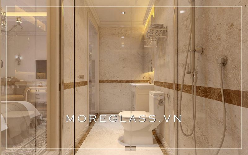 Mẫu thiết kế phòng tắm khách sạn hiện đại sử dụng cửa kính cường lực trong suốt mang vẻ đẹp sang trọng, tinh tế.