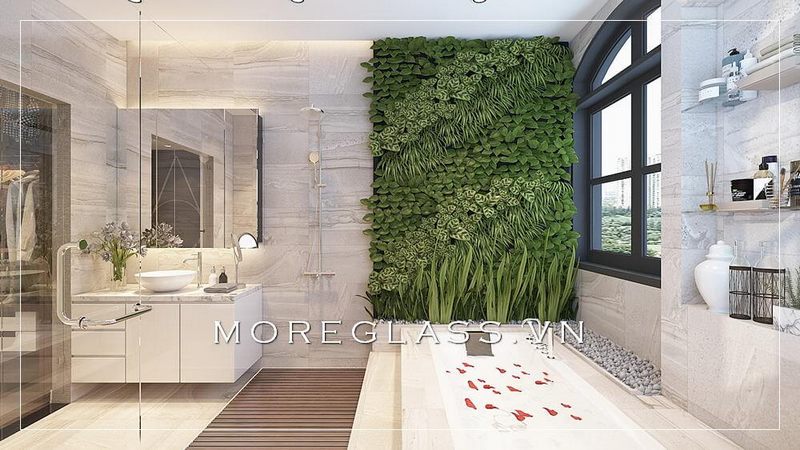 Mẫu thiết kế phóng tắm hiện đại cho nhà biệt thự, có bồn tắm nằm thư giãn và phòng tắm kính kết hợp bức tườn cây xanh mang đến không gian thư giãn tuyệt vời