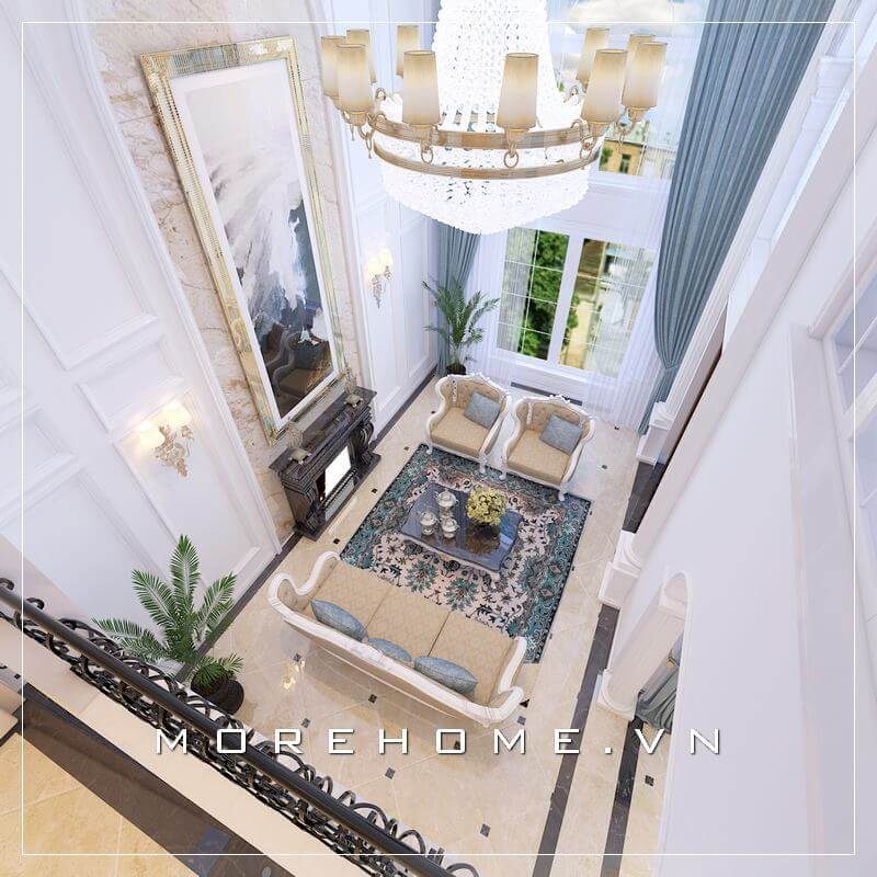 Không gian phòng khách biệt thự đầy thu hút với tâm điểm là bộ sofa văng bọc vải màu kem sang trọng kết hợp ghế sofa đơn tiện lợi.