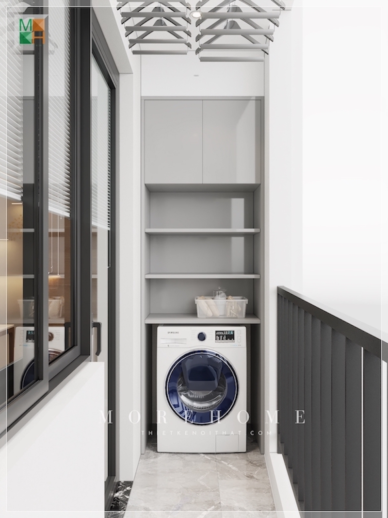 Tủ đựng đồ giặt: Sắp xếp một tủ nhỏ hoặc kệ để đựng đồ giặt, bột giặt, nước xả, và các vật dụng cần thiết khác. Điều này giúp giữ gọn gàng và ngăn nắp không gian ban công.