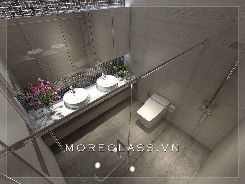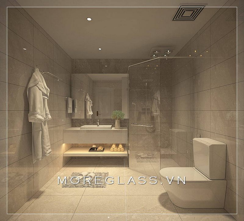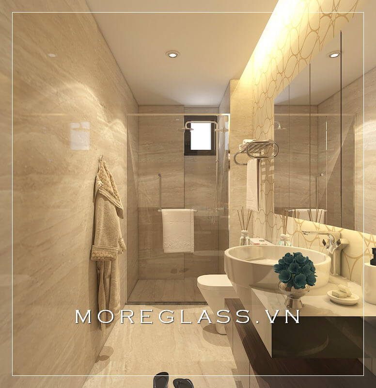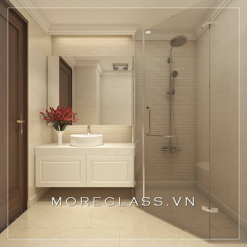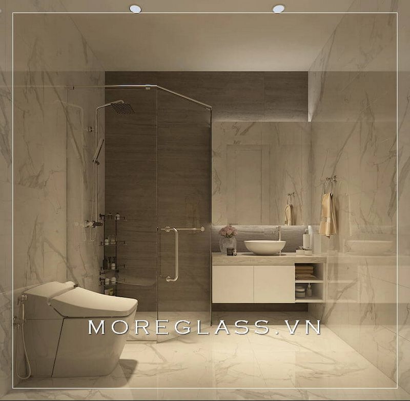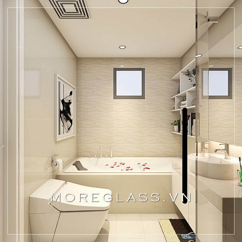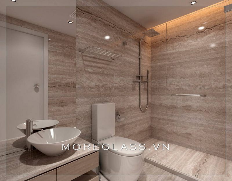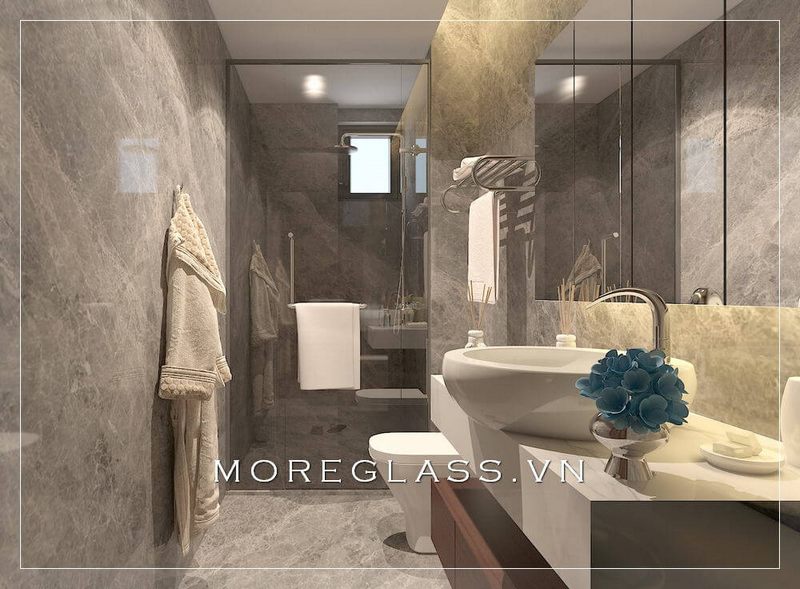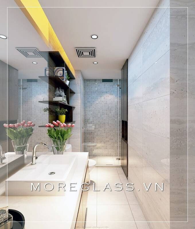 Thiết kế phòng tắm chung cư hiện đại sử dụng kính cường lực cao cấp ngăn nước hắt ra nội thất mang đến sự sang trọng, độc đáo