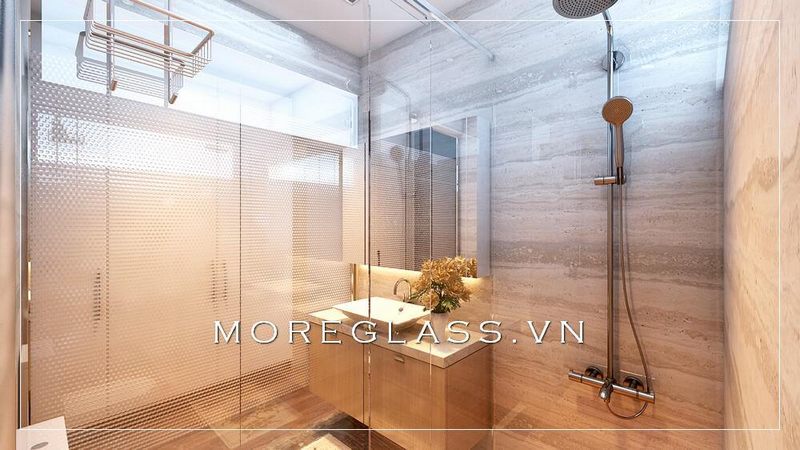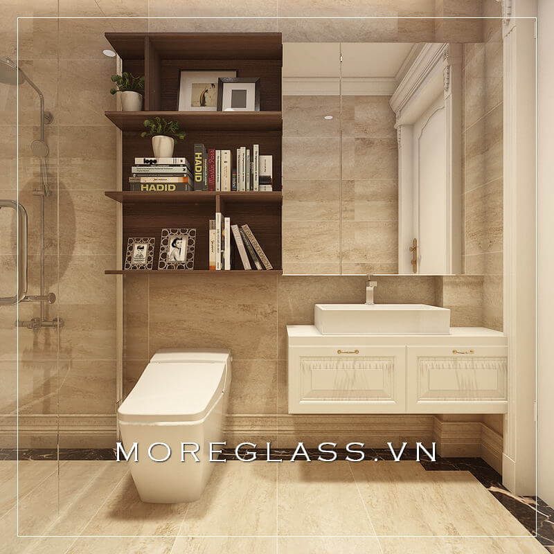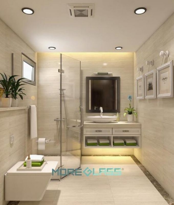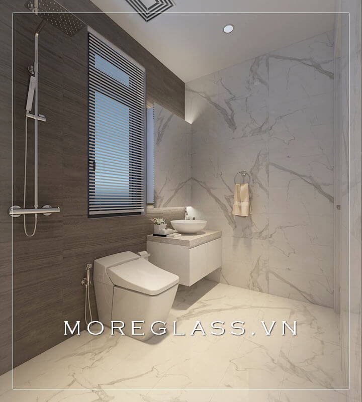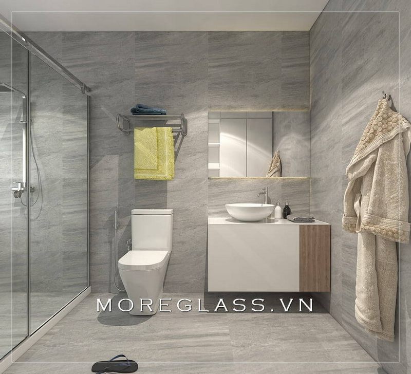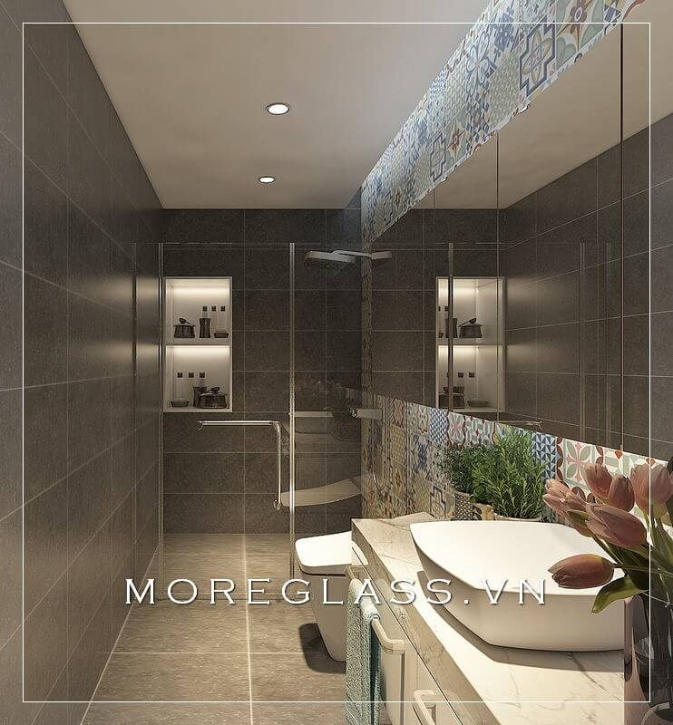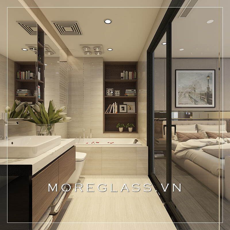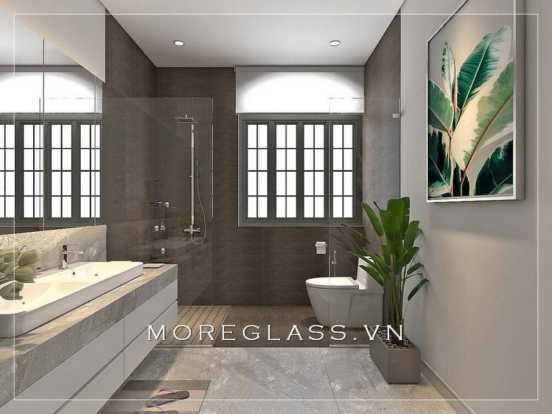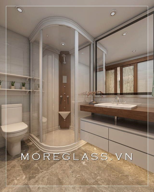 Thiết kế phòng tắm chung cư hiện đại sử dụng kính cường lực cao cấp ngăn nước hắt ra nội thất mang đến sự sang trọng, độc đáo