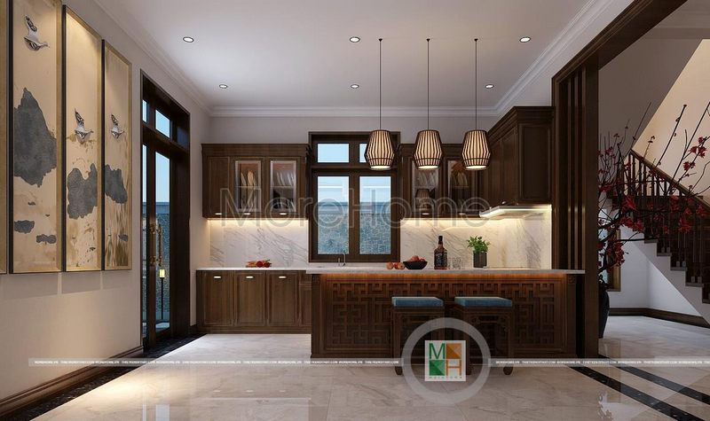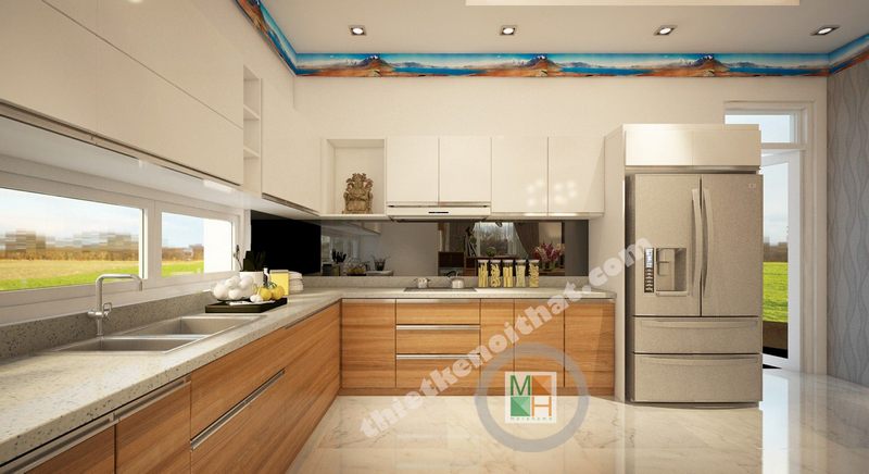 Tủ bếp chữ L đẹp và sang trọng cho không gian biệt thự