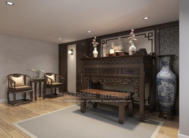 Mang đến không gian thờ cúng cho nhà phố sang trọng với mẫu bàn thờ gỗ tự nhiên cao cấp kết hợp nội thất cùng tông màu nâu trầm tạo sự sang trọng và lôi cuốn