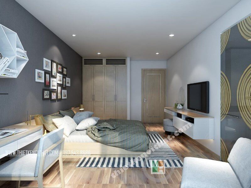 Bố trí nội thất phòng ngủ nhỏ hiện đại, chất liệu gỗ công nghiệp chủ đạo giúp tạo thêm sự nhẹ nhàng và thanh lịch hơn